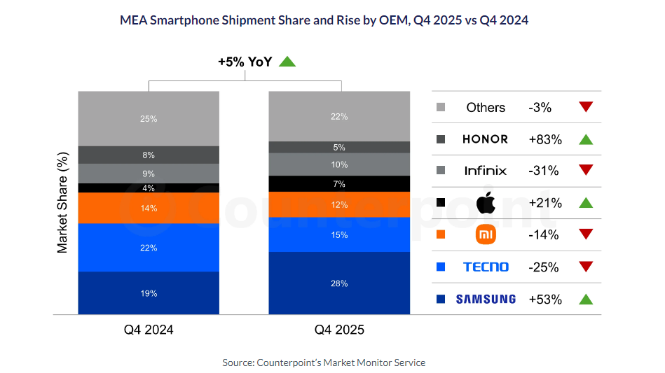 市场研究机构Counterpoint Research于3月4日发布的最新报告显示,2025年第四季度,中东和非洲(MEA)智能手机市场出货量同比增长5%,连续第三个季度保持稳步增长。从品牌竞争格局来看,三星表现尤为突出,当季出货量同比大幅增长53%,成功夺回中东和非洲地区智能手机销量冠军的位置,这也是其连续第二个季度超越传音。