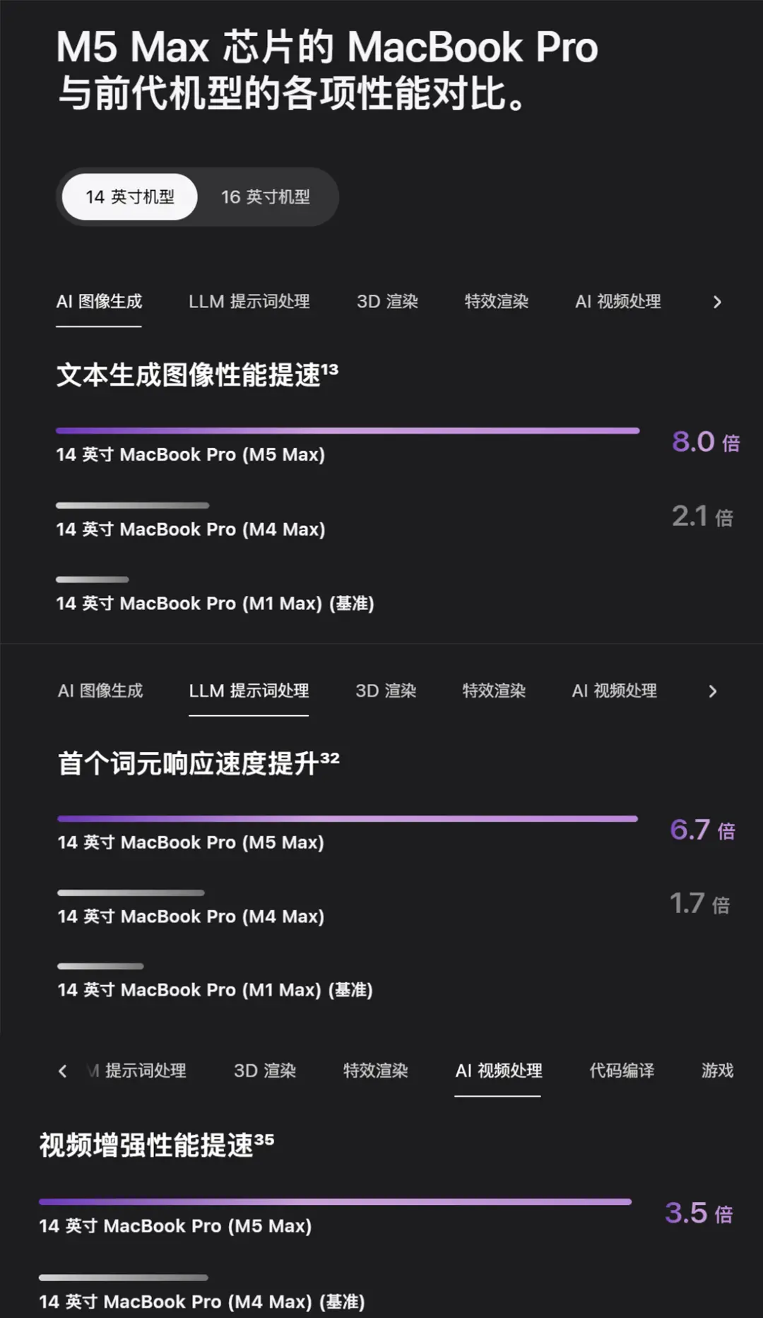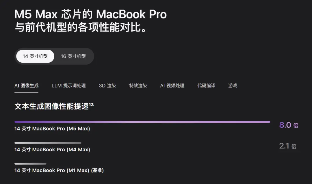 比如在AI图像生成任务中,搭载M5 Max的MacBook Pro比上代快了近4倍,在大语言模型提示词处理、AI视频处理方面也有数倍提升。