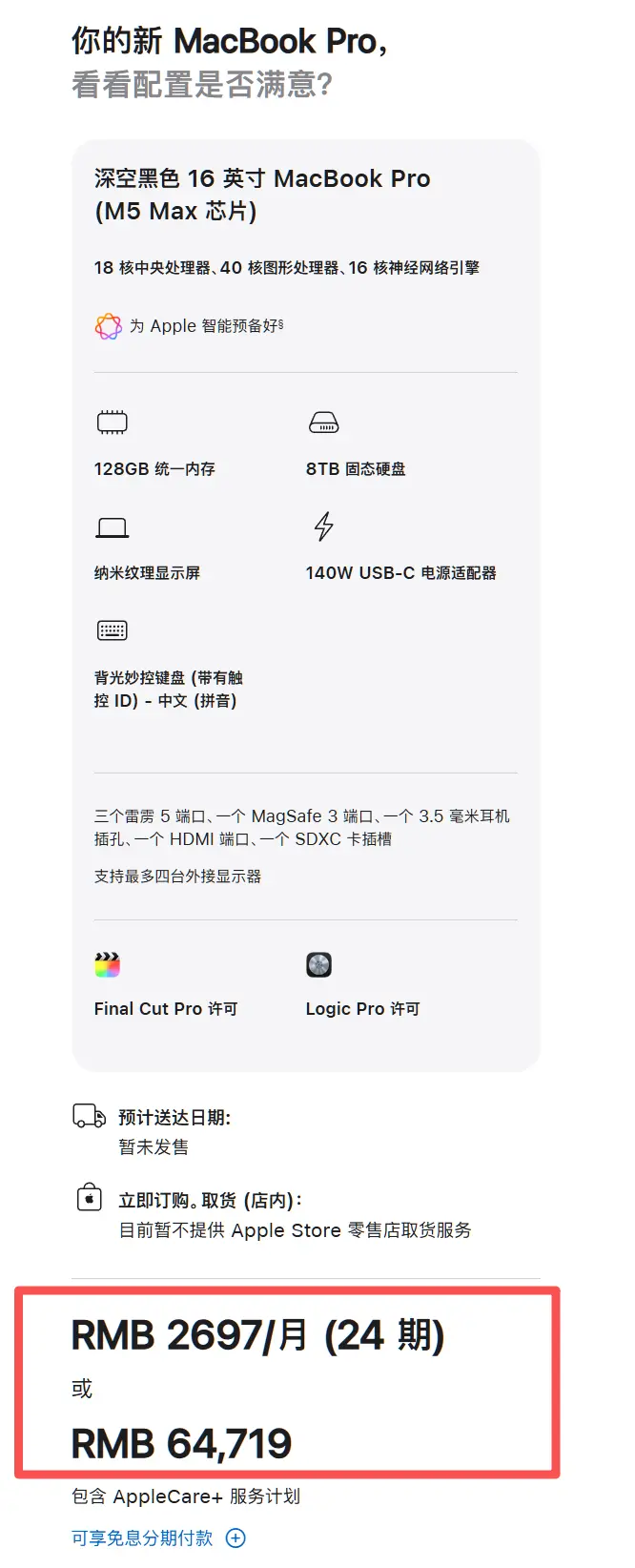 价格方面,14英寸搭载新M5 Pro的MacBook Pro起售价为17999元,存储为24GB+1TB起步,如果是16英寸M5 Max版全部“拉满”,总价最高在64719元,当然,这包含了两款软件和Apple Care服务,去除后大约58124元。