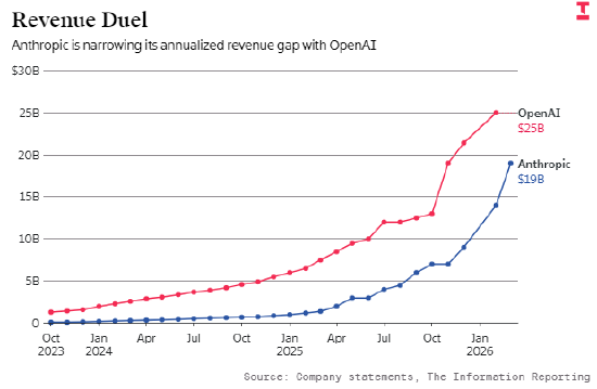 Anthropic 凭借主打代码生成的 AI 模型大获成功,迅速缩小了与 OpenAI 的营收差距。2025 年时,OpenAI 的营收规模还是 Anthropic 的三倍左右。