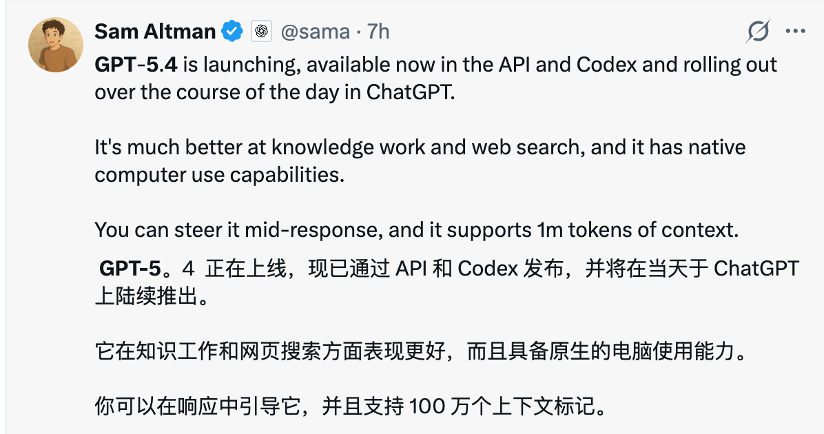 接下来,OpenAI将在ChatGPT和API中推出GPT-5.4 Pro,面向希望在复杂任务上获得最高性能的用户。