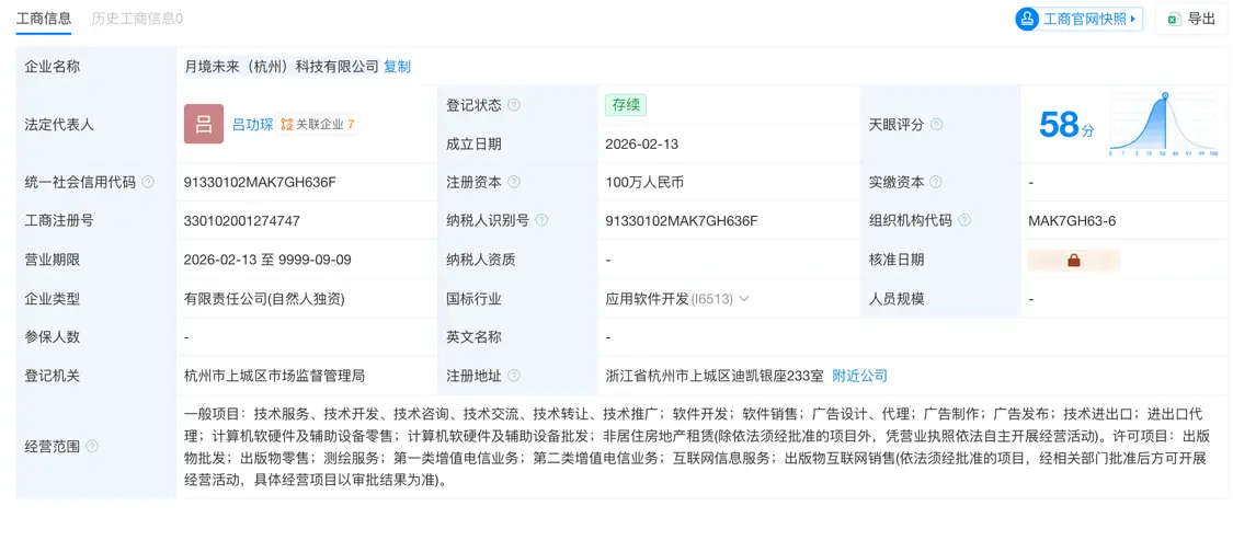 天眼查显示,月境未来 (杭州) 科技有限公司,成立于2026年,位于浙江省杭州市,是一家以从事软件和信息技术服务业为主的企业。企业注册资本100万人民币。吕功琛为该公司法人、实际控制人。