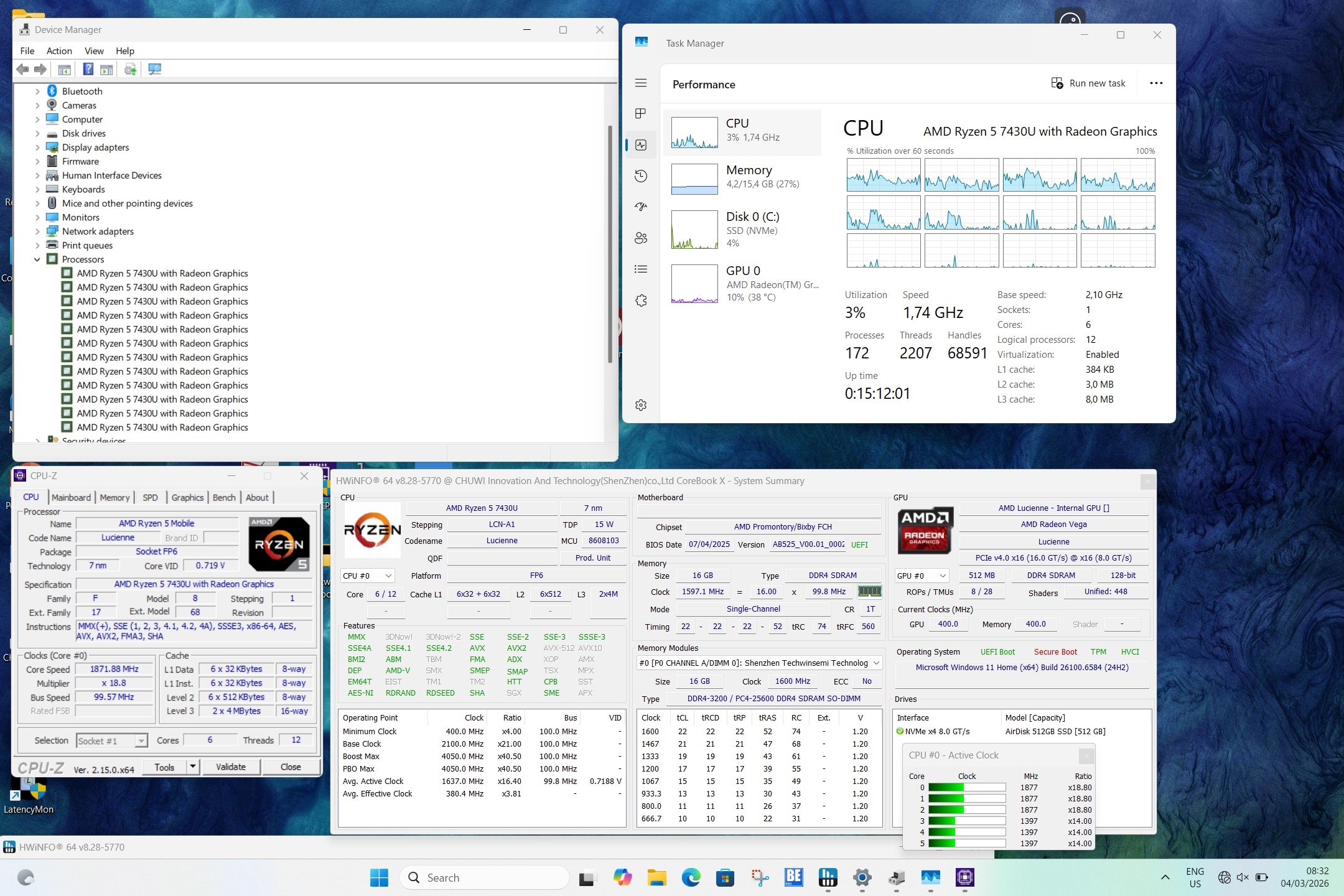 更令人震惊的是,驰为涉嫌通过BIOS固件层面的修改,刻意伪造处理器身份。在BIOS、Windows系统,甚至CPU-Z、HWiNFO64等权威硬件诊断工具中,该芯片均显示为锐龙5 7430U。