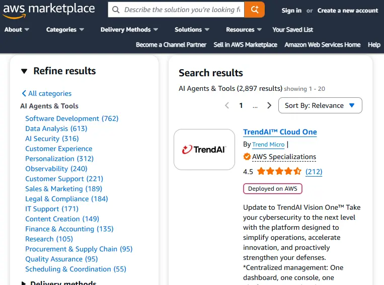 在亚马逊的AWS Marketplace中,客户可以购买近上万个人工智能代理和工具,类别涵盖软件开发、数据分析、法律顾问、财务会计、市场营销等。