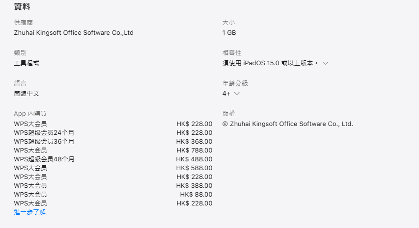 在付费方面,应用提供多种内购项目,包括WPS大会员与WPS超级会员,其中24个月超级会员价格为228港币。