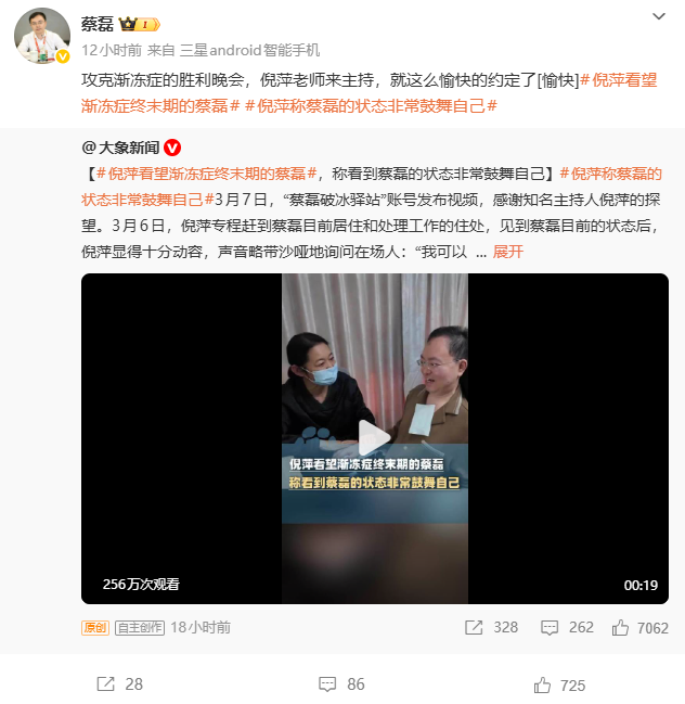 日前,知名主持人倪萍探望了渐冻症抗争者、京东集团前副总裁蔡磊。蔡磊随后转发“倪萍看望渐冻症终末期的蔡磊”相关微博并发文回应:攻克渐冻症的胜利晚会,倪萍老师来主持,就这么愉快的约定了。