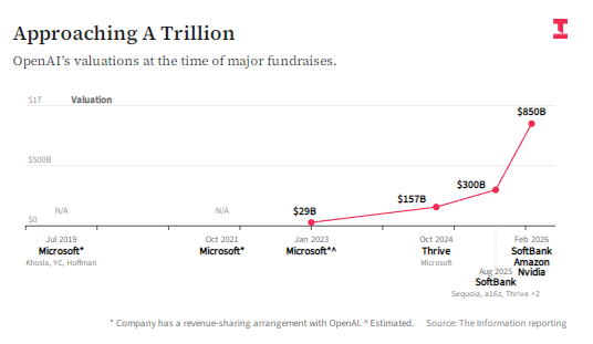 该公司正以8500 亿美元估值完成新一轮融资,投资方包括英伟达、亚马逊和软银,这一估值已显得昂贵,而投行很可能将其 IPO 定价定在更高水平。按 8500 亿美元计算,OpenAI 估值是其 2026 年预期营收的 28 倍。相比之下,英伟达的预期市销率仅为 12 倍。(8500 亿美元包含本轮融资金额。)