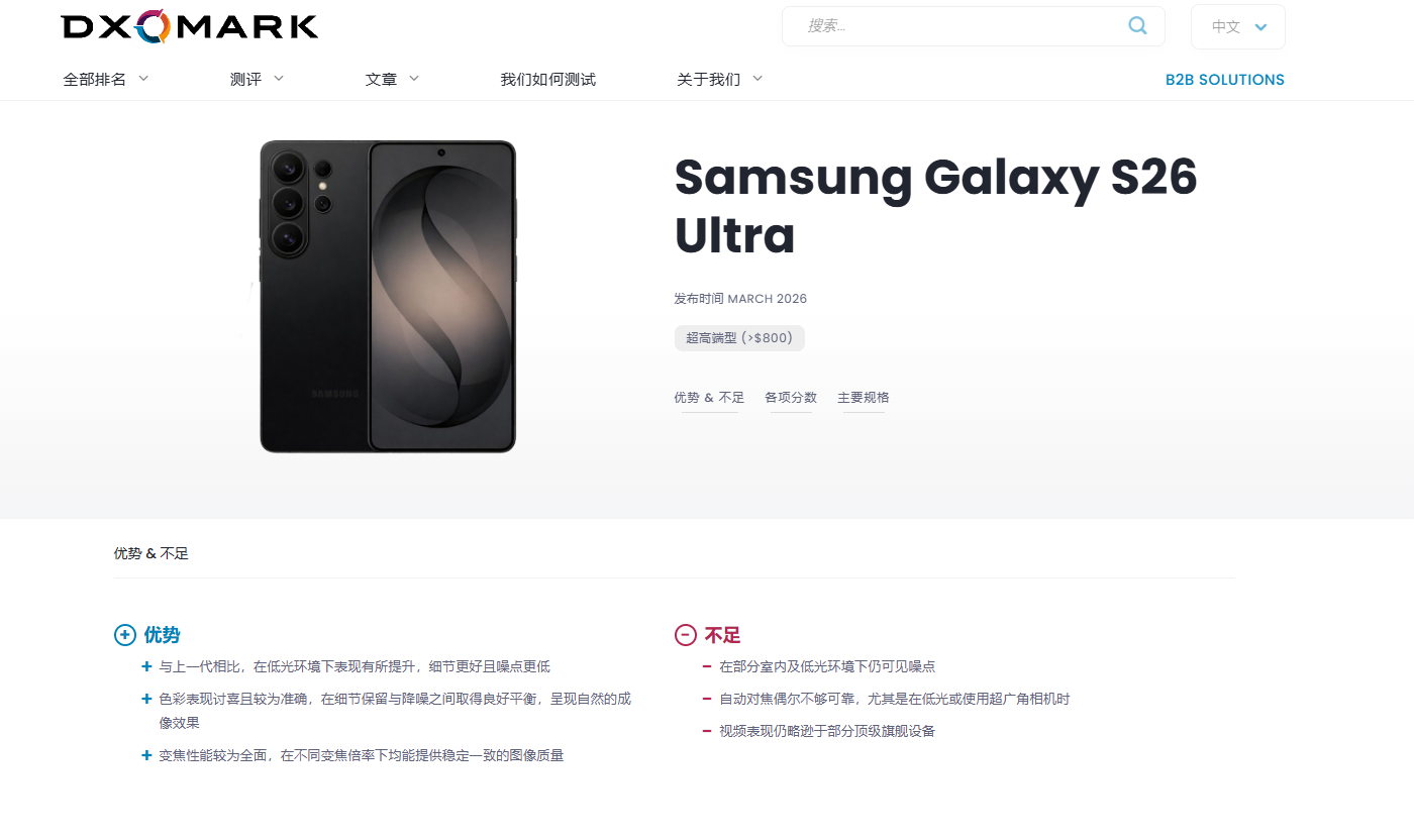 三星Galaxy S26 Ultra DXO影像得分157:全球第18 不敌小米17 Pro Max