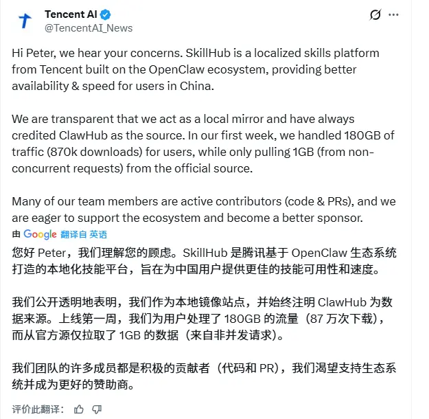 面对开发者的质疑,腾讯官方迅速作出回应,强调SkillHub在上线首周为用户处理了180GB的数据流量,但实际仅向官方源站发起1GB的非并发请求,在客观上大幅缓解了原项目的运行负荷。同时,腾讯相关代表就服务器负载骤增的情况表达了歉意,并透露目前团队内有多名活跃代码贡献者,未来有意愿作为赞助方为该生态提供持续的技术与资金支持。