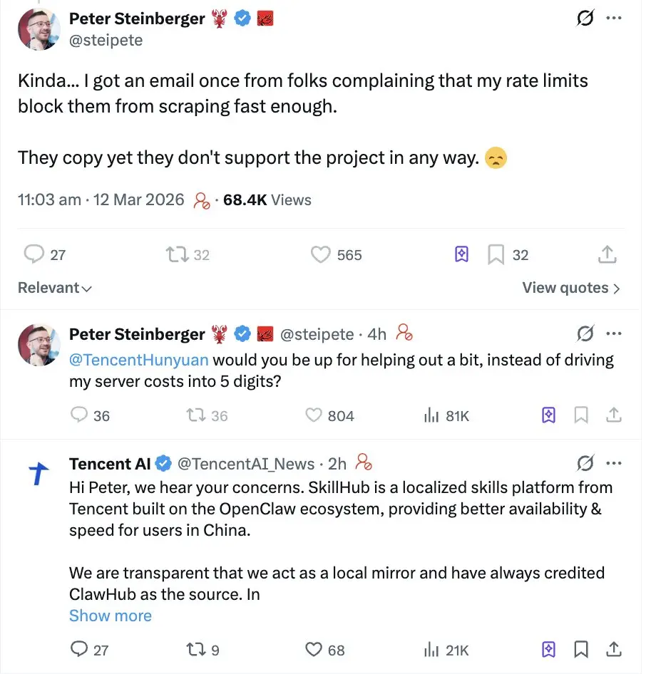 “龙虾之父”质疑SkillHub未经沟通抓取数据 腾讯回应并致歉