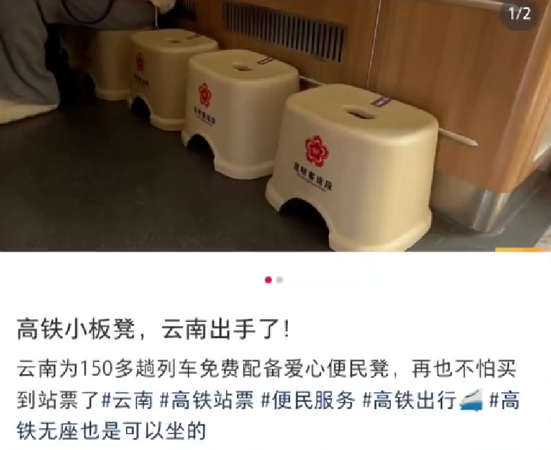 目前中国铁路昆明局集团有限公司已经在150多趟客流量较大的列车上配备了共计5000个爱心便民凳,免费提供给无座旅客使用。