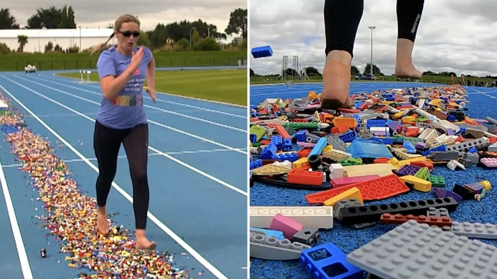 “赤脚在乐高积木上跑100米最快纪录”:新西兰人加布里埃尔·沃尔,在100米赛道上铺满了661磅乐高积木,然后赤脚跑出24.75 秒成绩。