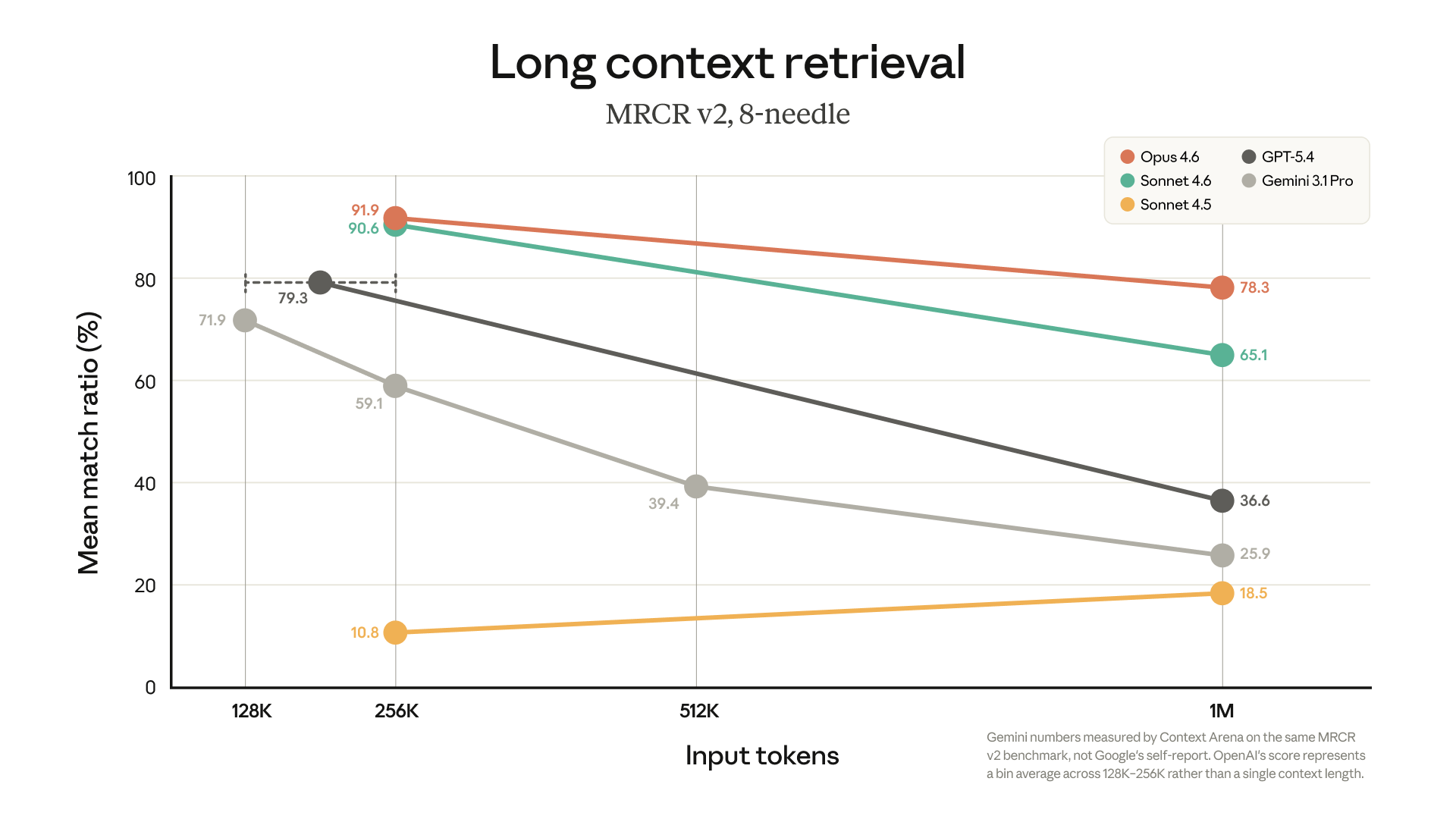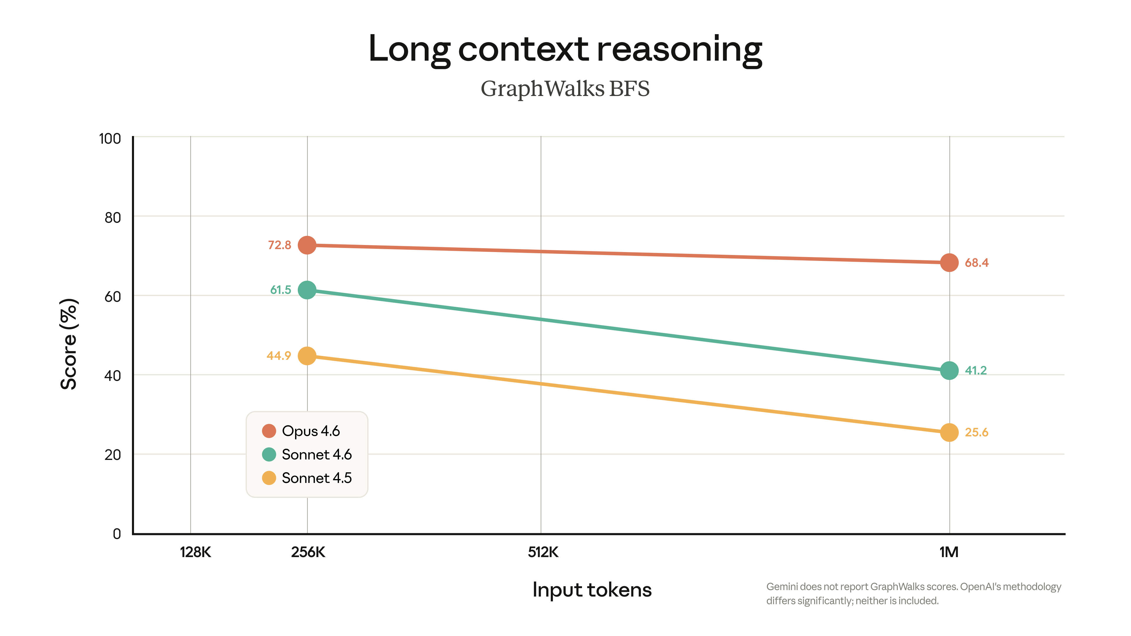 在企业与专业场景中,1M 上下文的影响尤为突出。官方强调,长上下文只有在“记得住又用得好”的前提下才有意义,因此在 Opus 4.6 与 Sonnet 4.6 上针对长程记忆与推理能力进行了专项优化。 在第三方基准测试中,Opus 4.6 在 MRCR v2 上取得 78.3% 的成绩,Sonnet 4.6 在 GraphWalks BFS(1M token)上得分 68.4%,在同等上下文长度的前沿模型中处于领先水平。