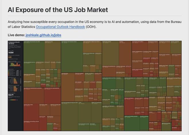 “这是我在周六早上花了两小时,受我正在读的一本书启发,采用‘氛围编程’(vibecoded)搞出来的小项目,”他周日早上在X上解释道,“我本以为这些代码和数据能帮别人直观地探索劳工统计局的数据集,或者用不同的方式着色、换换提示词 (Prompts),甚至加入他们自己的可视化效果。结果这组数据被严重误读了(尽管我写了说明文档,但我早该料到会这样),所以我把它撤掉了。”