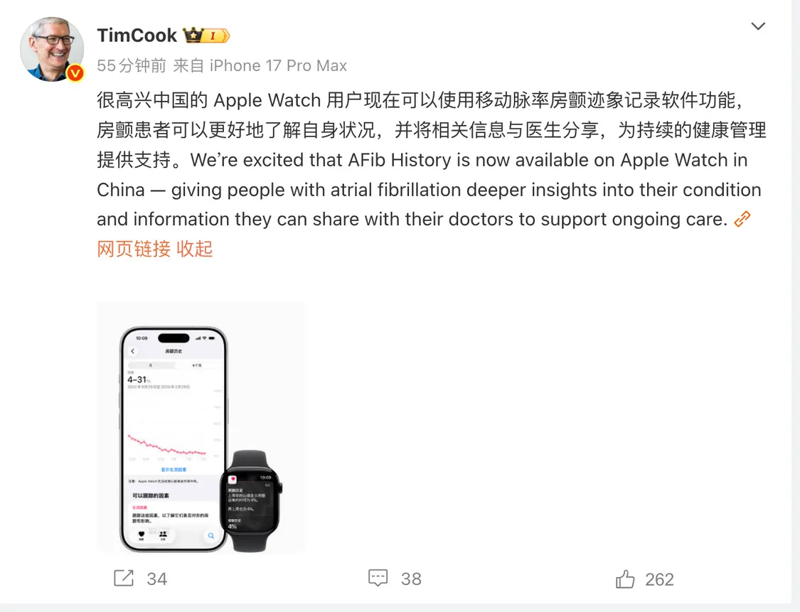 3月17日,苹果CEO库克发文宣布,中国的Apple Watch用户现在可以使用移动脉率房颤迹象记录软件功能,房颤患者可以更好地了解自身状况,并将相关信息与医生分享。