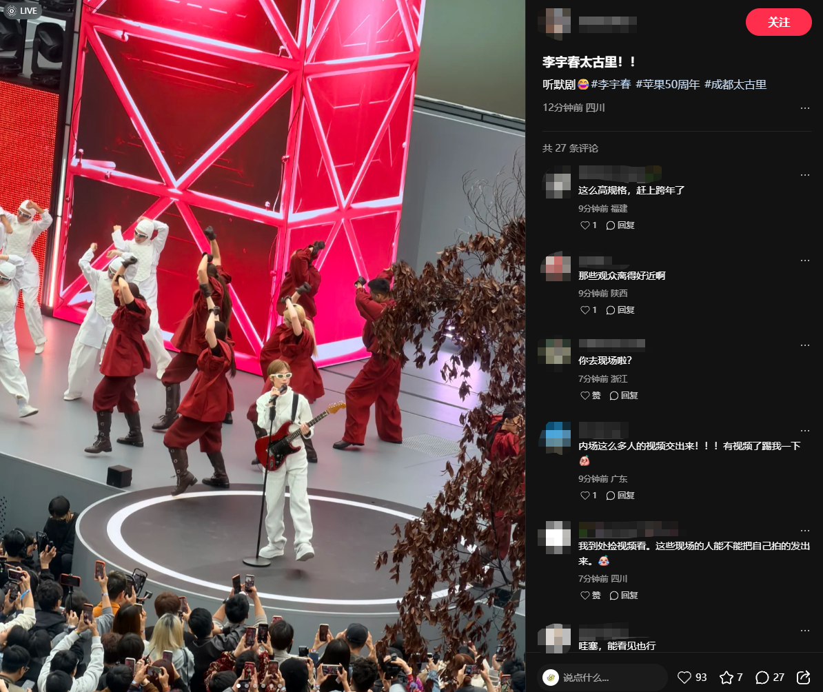 今日,成都太古里Apple Store举办苹果成立50周年庆活动,苹果CEO蒂姆·库克出席活动,引来大批围观人群。从网友晒出的现场照片来看,歌手李宇春受邀参加此次活动,并登台献艺演唱歌曲。