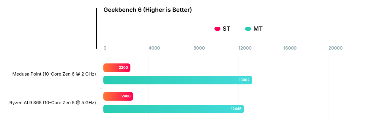 AMD代号Medusa Point的下代Zen 6架构APU工程样品再度现身Geekbench,测试成绩较首次曝光实现近乎翻倍提升。本次泄露的样品仍标识为锐龙9系列,采用10核心20线程设计,核心配置为4颗经典Zen 6核心加6颗能效优化核心的组合方案。