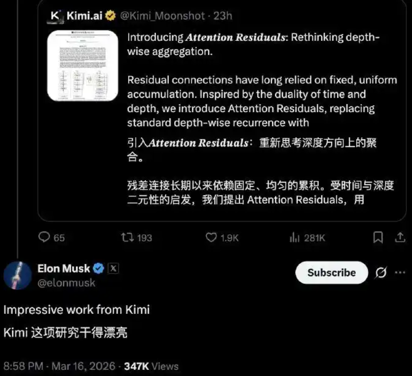 3月16日晚间,特斯拉CEO马斯克在社交平台公开发声,点赞中国人工智能企业月之暗面(Kimi)团队的最新技术成果,直言这项工作“令人印象深刻”,将这款国产大模型的前沿研究推向公众视野。