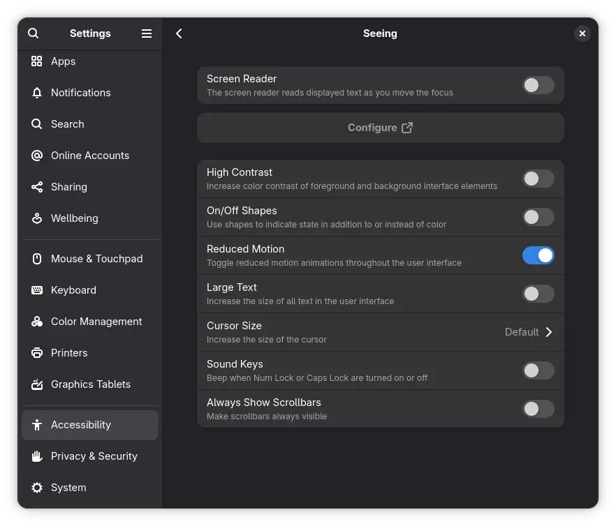 本次更新中最受关注的变化,是对可变刷新率(VRR)和原生分数缩放的正式支持,只要硬件条件允许,这两项特性即可直接启用。 除此之外,GNOME 50 还引入了低延迟鼠标指针模式,在 VRR 激活时可以让光标刷新独立于其后方的窗口内容,从而改善交互体验。 为了缓解 NVIDIA 平台上的卡顿与帧时间异常问题,开发者还针对 NVIDIA 驱动加入了相应“变通方案”,官方表示,这将让使用 NVIDIA 显卡的用户在窗口动画和桌面流畅度方面有“明显改善”。