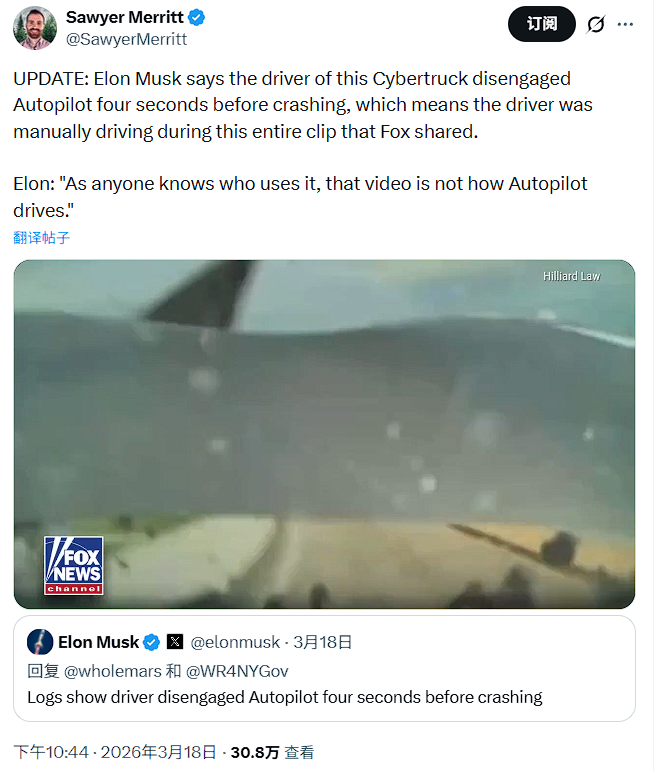 针对此事,特斯拉CEO马斯克近日在社交平台X上进行回应:驾驶日志已经显示,驾驶员在碰撞前四秒主动关闭了Autopilot。