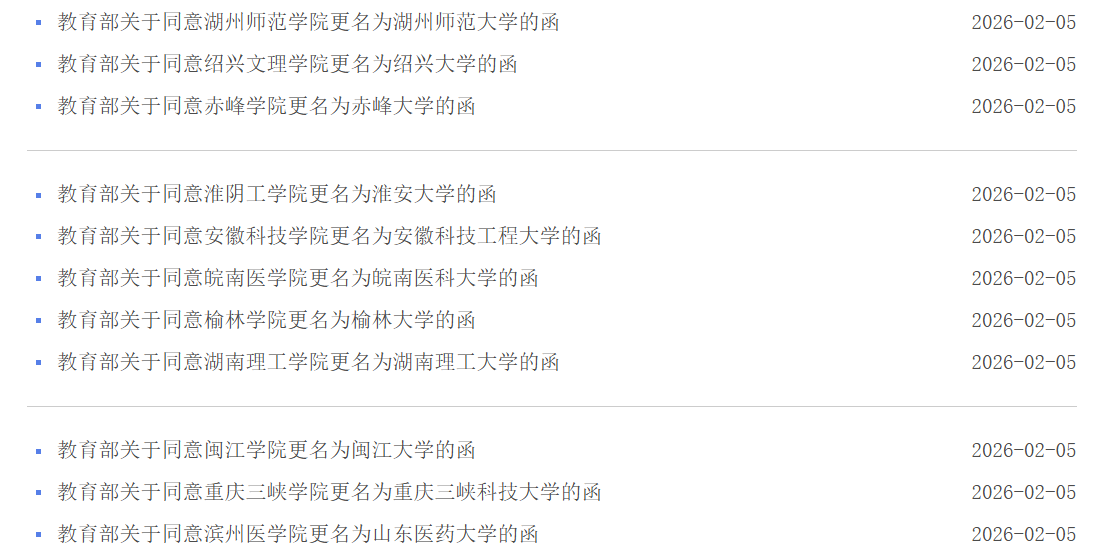 湖州师范学院更名为湖州师范大学,绍兴文理学院更名为绍兴大学,赤峰学院更名为赤峰大学,淮阴工学院更名为淮安大学,安徽科技学院更名为安徽科技工程大学,皖南医学院更名为皖南医科大学,榆林学院更名为榆林大学,湖南理工学院更名为湖南理工大学,闽江学院更名为闽江大学,重庆三峡学院更名为重庆三峡科技大学,滨州医学院更名为山东医药大学。