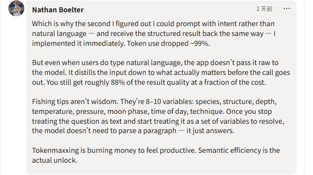 更有工程师分享了更精明的使用策略,将自然语言提示词提炼为关键变量,而非将完整段落原封不动地传递给模型。通过这种方式,Token使用量可以下降约99%,而效果仍能保留近九成。这位评论者直言:“Tokenmaxxing是在烧钱来假装有生产力,语义效率才是真正的解锁之道。”