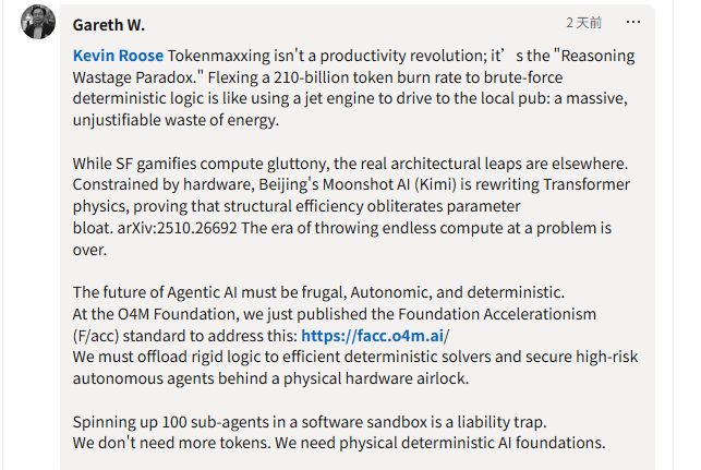 另一位评论者则从技术架构的角度提出了更根本的思考。他认为,真正的突破在于用结构效率取代参数膨胀。用消耗数百亿Token的蛮力来解决确定性逻辑问题,就像开着喷气发动机去酒吧,这是一种巨大的、毫无道理的能源浪费。智能体AI的未来应该是节俭的、自主的、确定性的,将刚性逻辑卸载给高效的求解器,而不是在软件沙箱中无节制地生成数百个子智能体。