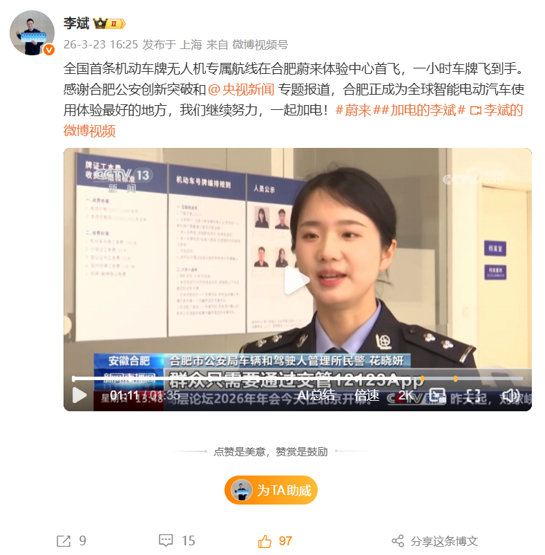 蔚来董事长李斌今日发文称,全国首条机动车牌无人机专属航线在合肥蔚来体验中心首飞,一小时车牌飞到手。对于合肥公安创新突破和@央视新闻的专题报道,李斌也表达了感谢,同时指出,合肥正成为全球智能电动汽车使用体验最好的地方。