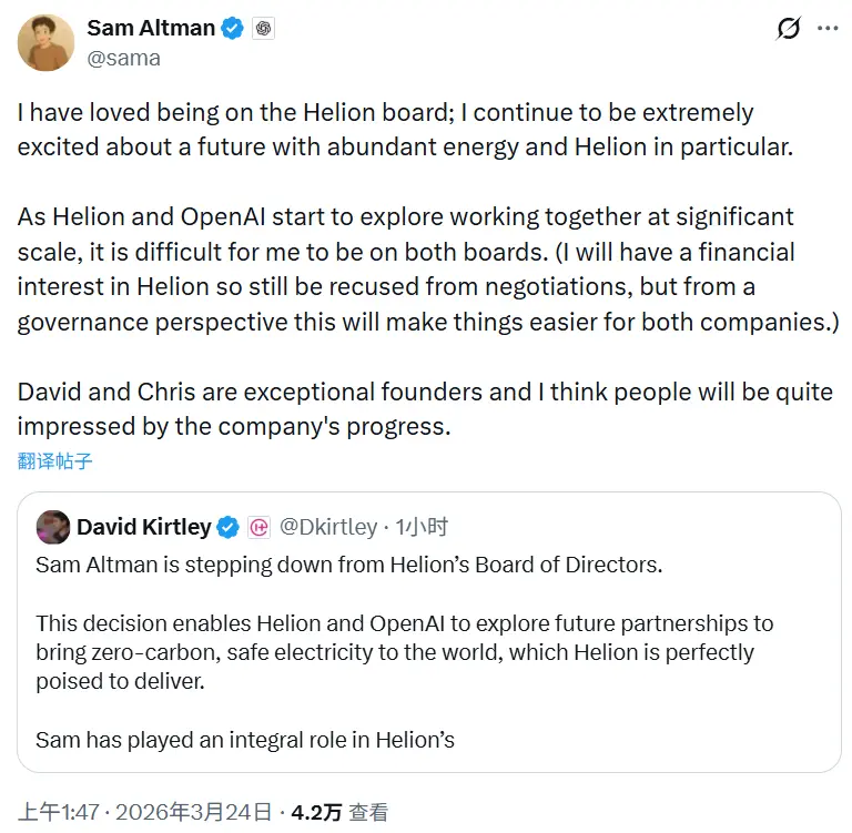 OpenAI与聚变初创公司Helion洽谈大型能源交易 奥尔特曼辞职避嫌