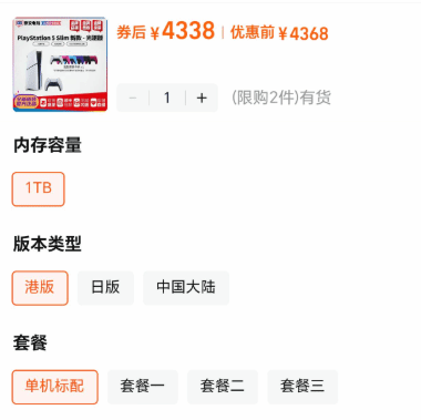2026年3月25日消息,有玩家发现,原本价格稳定的 PS5 基础款竟悄然开启了涨价模式。目前PS5 Slim国行光驱版在主流电商平台的售价维持在3600元左右,价格已经不算低。然而,近日有玩家晒出的一张店铺截图却引发了轩然大波:图中显示的港版光驱版PS5价格竟高达4300元。