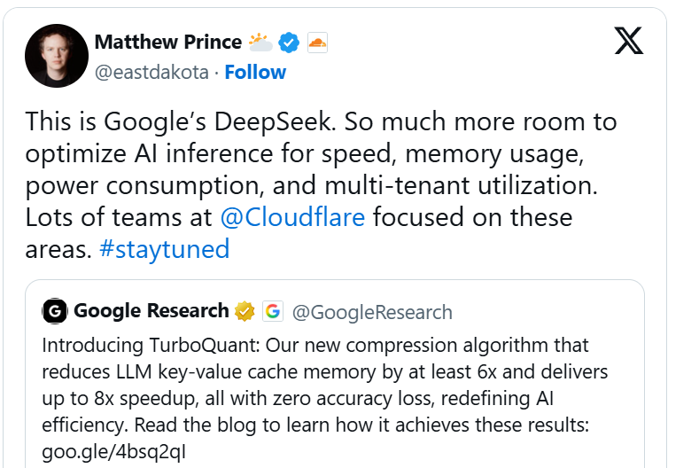 Cloudflare首席执行官Matthew Prince等人甚至称之为Google的DeepSeek时刻,认为其有望像DeepSeek一样,通过极高的效率收益大幅拉低AI的运行成本,同时在结果上保持竞争力。