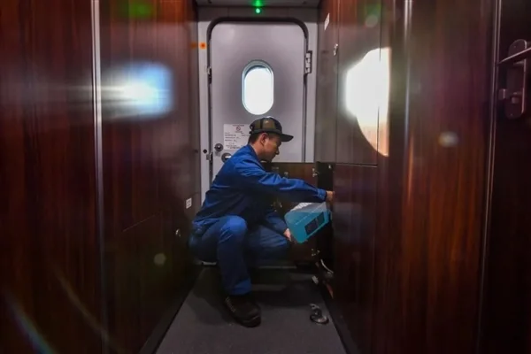 以复兴号智能动车组为例,玻璃水注水口与水箱位于司机室门外下方的柜子内,水箱配有液位显示仪,方便工作人员查看余量并及时补充。