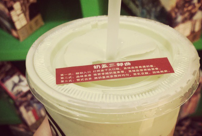 现在应该没人不知道奶盖咋喝,但在当时,奶盖是一个绝对前卫的事物,前卫到每杯奶茶在出品时,还得贴个小 “ 说明书 ” ,告诉顾客怎么喝第一口。