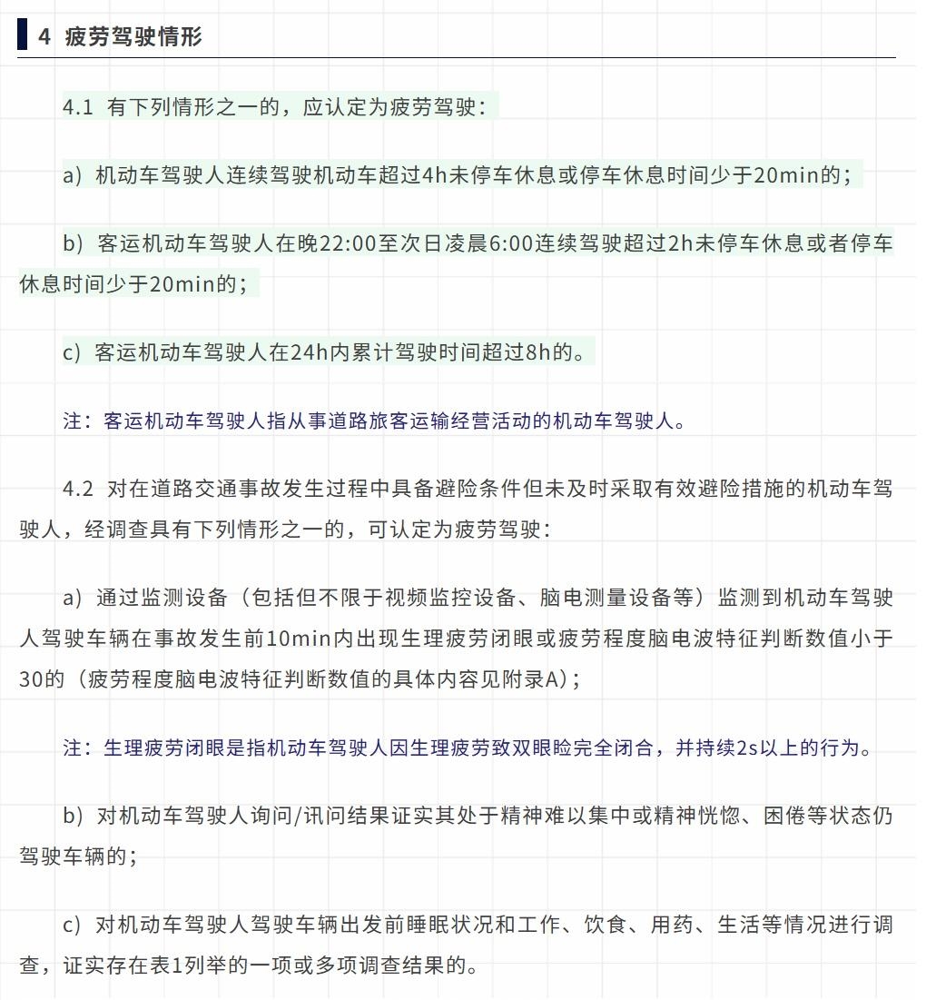 新规还对客运车辆作出更严格规定,22时至次日6时客运驾驶人连续驾驶超2小时未休息或休息不足20分钟,24小时内累计驾驶超8小时,同样认定为疲劳驾驶。