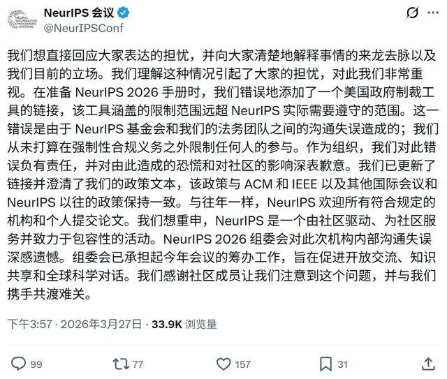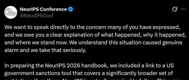 今天下午,AI三大顶会之一NeurIPS官方在X平台发布声明,就此前引发轩然大波的制裁合规条款正式致歉。声明称,在编写NeurIPS 2026手册的过程中,NeurIPS加入了一个美国政府制裁查询工具的链接,其覆盖范围远超NeurIPS实际需要遵守的限制,系基金会与法律团队之间的沟通失误,从未有意将参与限制扩大到强制合规义务之外。