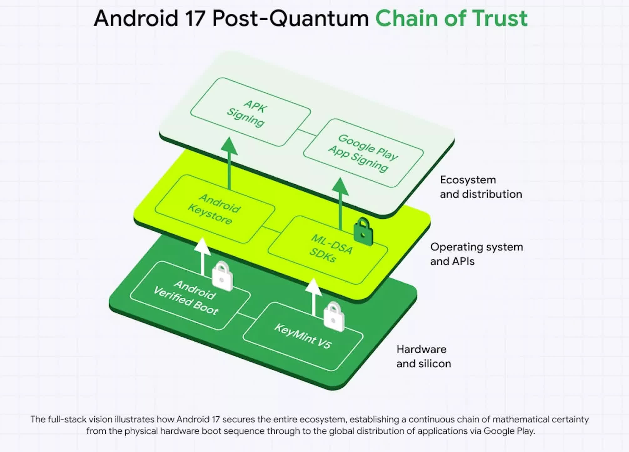 在基础设施总体路线图之外,Google此次还首次系统性披露了让 Android 平台实现量子抗性的计划。 根据另一篇面向开发者的安全博客,Google将从 Android 17 测试版开始加入由美国国家标准与技术研究院(NIST)标准化的数字签名算法 ML-DSA,并将其集成进 Android 的硬件信任根,用于应用签名与验证流程中的后量子密钥支持。