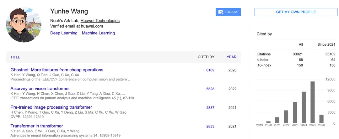 学术成果方面,根据Google Scholar,王云鹤的被引数为33109,h-index为68。