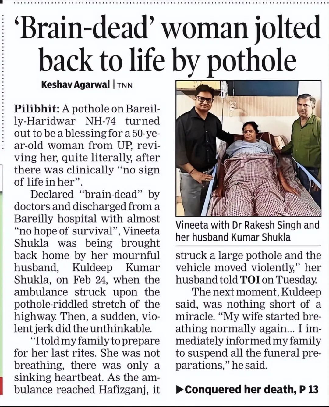 2月24日,印度北方邦的维妮塔·舒克拉被医生宣布“脑死亡”。她的脑干反射消失,无法自主呼吸,深度昏迷,格拉斯哥昏迷评分只有3分,而完全清醒的人的评分是 15 分,分越低情况越差。和医生沟通之后,家人得知她“已无恢复意识的可能,生命体征也在下降”,悲痛欲绝,决定让她出院回家,并通知家人准备葬礼。