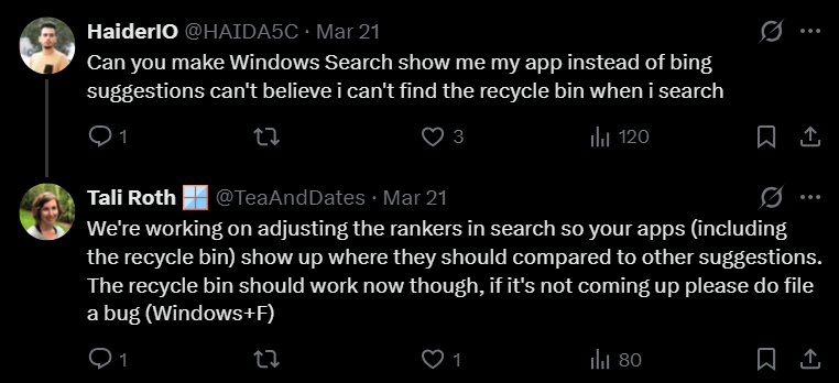 在 Tali Roth 关于开始菜单、任务栏和文件资源管理器改进的讨论贴下,搜索被反复点名为“系统中最让人讨厌的一部分”。 Roth 随即回应称,团队正在为 Windows 搜索准备大量改进,并且已经在调整内部“排名器”(rankers),以确保用户安装的应用(包括回收站等核心组件)能在搜索结果中排在应有的位置,而不是被各种建议和网络结果压下去。