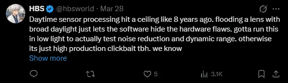 也有网友指出,传感器在白天的处理能力大概在8年前就已达到瓶颈,在强光下拍摄,其实只是让软件有机会掩盖硬件的不足,若想真正测试降噪和动态范围,应在低光场景下进行。