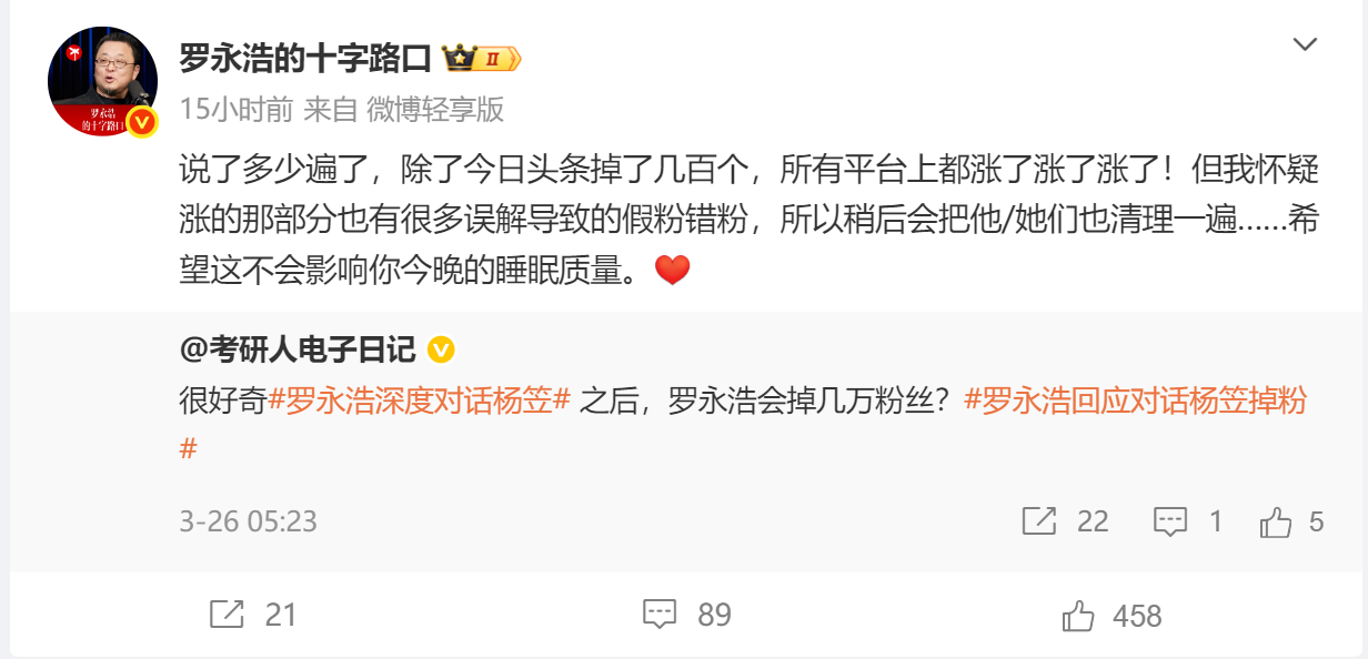 罗永浩否认对话杨笠掉粉:很多平台都涨了 后续会清粉