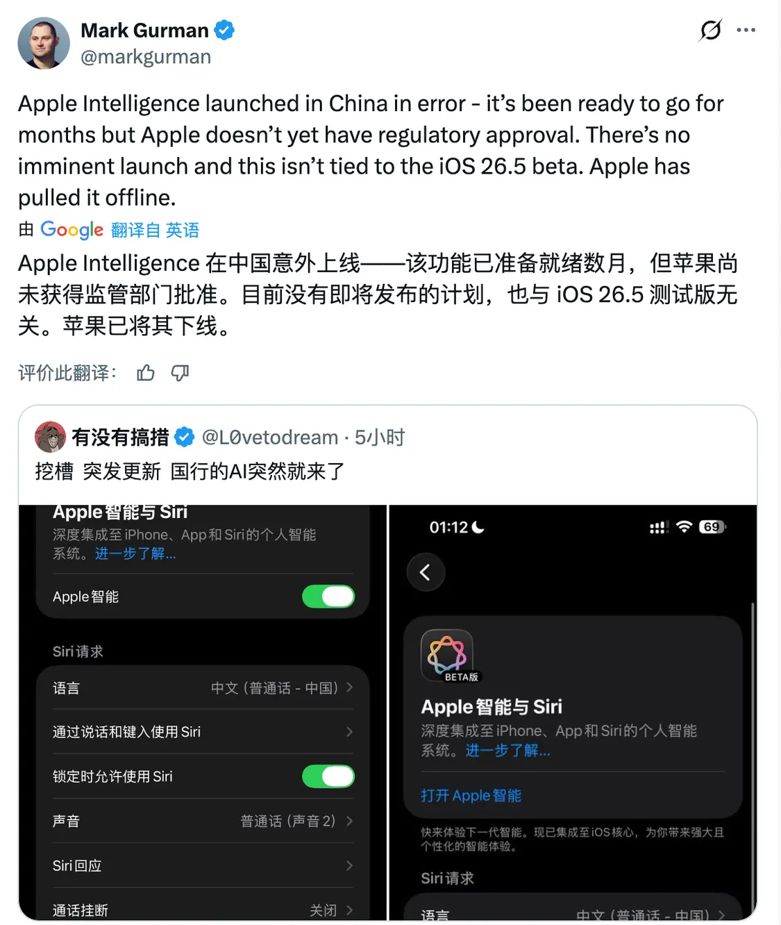 “Apple Intelligence在中国因误操作意外上线,该功能已准备就绪数月,但苹果尚未获得监管批准。不会很快推出,此事也与iOS 26.5测试版无关。苹果已将该功能下线。”古尔曼称。