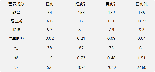 虽然腐乳的营养看起来很好,但也存在一个不可忽视的问题,那就是盐含量着实不低。根据《中国食物成分表》中的数据,红腐乳、青腐乳、白腐乳的钠含量分别高达 3091mg/100g、2012mg/100g、2460mg/100g,是豆腐钠含量的 350~550 倍。