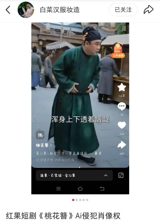 近日,一位名为白菜汉服妆造的妆造师在社交平台上公开维权,称红果短剧桃花簪未经许可,擅自通过AI技术使用了其拍摄过的照片,严重侵犯了其肖像权。该博主表示,短剧中的服装、配饰乃至妆容细节都与自己的原片一模一样。令博主难以接受的是,短剧通过AI处理后的形象,竟被塑造成了一个贪财好色的人物。