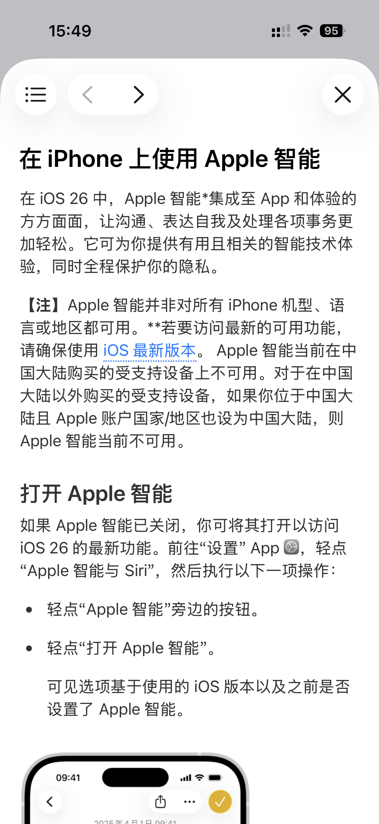 对于在中国大陆以外购买的受支持设备,如果你位于中国大陆且Apple账户国家/地区也设为中国大陆,则苹果智能当前不可用。