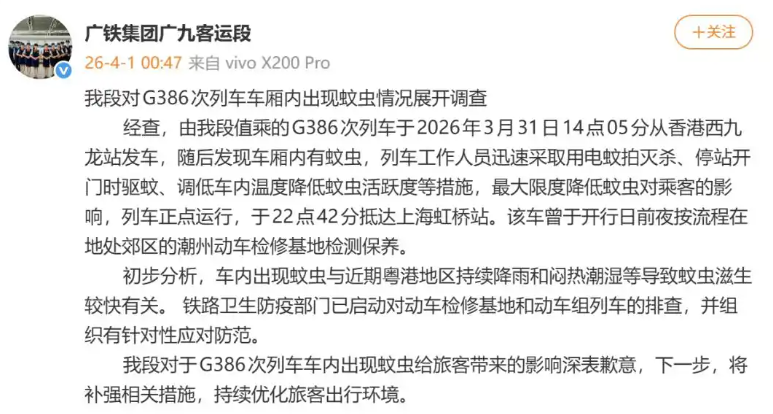 4月1日凌晨,广铁集团广九客运段就此事发布了正式的情况说明。证实该次列车在3月31日行驶途中确实发现了蚊虫,并详细记录了当时的应对过程。