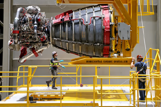 火箭底部安装有四台发动机,与助推器共同将 SLS 火箭推离地面。这些由 L3Harris 公司制造的发动机高 14 英尺,单台推力约 50 万磅。