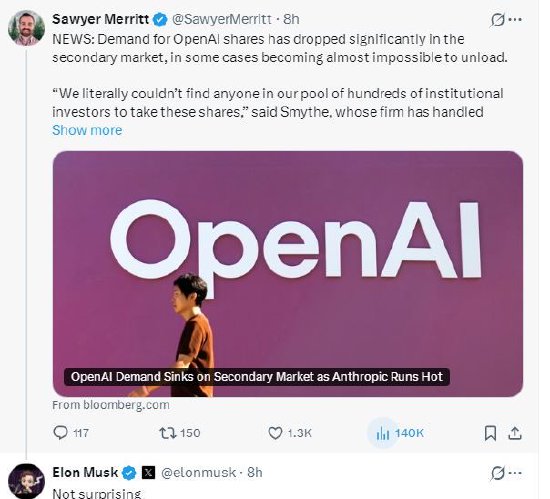 据报道,OpenAI的股票在二级市场已经失宠,在某些情况下甚至变得几乎无法出售,而投资者纷纷迅速转向其最大的竞争对手Anthropic。特斯拉CEO埃隆·马斯克在社交平台上回应了网友分享的相关报道,并评论称:“毫不意外。”
