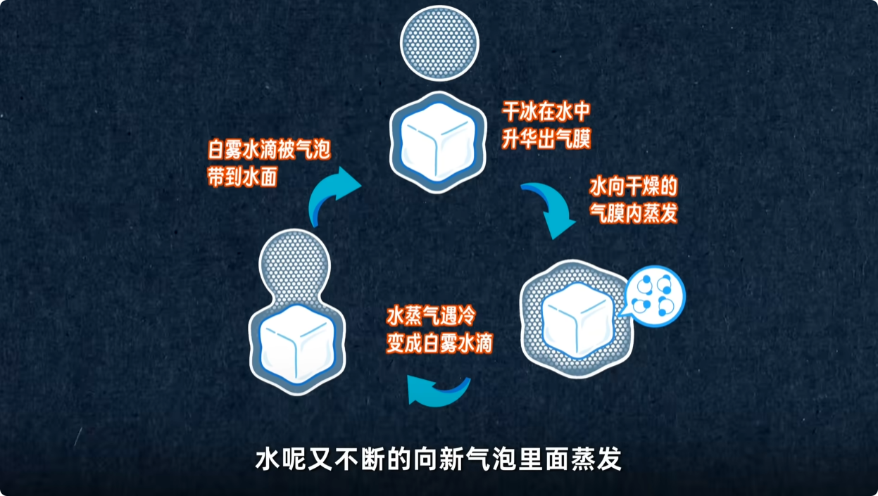 教材的解释只能产生很微弱的白雾。真正大量的白雾,并不是来自空气中,而是来自水中。干冰在水中升华生成气泡,水向干燥的气泡中蒸发,水蒸气在气泡内遇冷凝结成白雾,白雾再被气泡带到水面,这才是干冰入水时白雾又多又浓的核心原因。