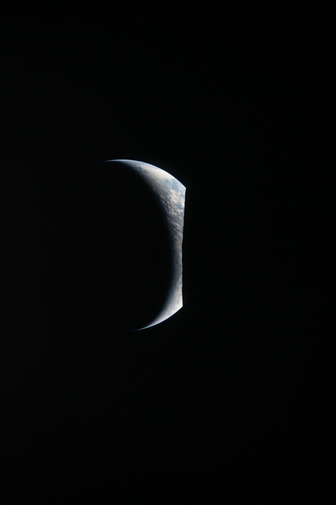 NASA放出了阿尔忒弥斯2号拍摄的首张月球背面视角地球照,这可是头一回从这个角度拍到地球沉进月球地平线的样子。这张照片拍于4月6日傍晚,是宇航员从猎户座飞船的窗口拍下来的。镜头里的地球带着淡淡的蓝色,裹着白白的云,慢慢落在坑坑洼洼的月球表面后面,像一弯月牙。